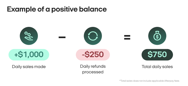 If your refunds are greater than your sales, you may not receive a daily settlement, and instead see a negative balance. This means that instead of Afterpay attempting to direct debit your account, we will apply any negative balances against your future orders.
